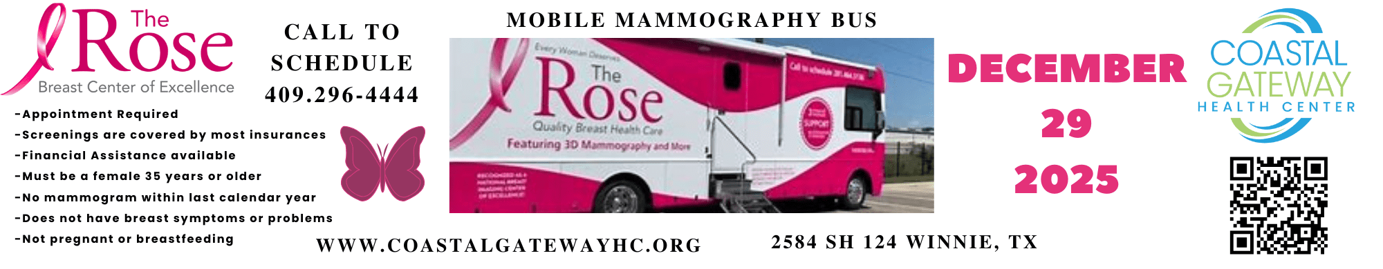 In collaboration with The Rose, Coastal Gateway Health Center will be hosting its next mobile mammography day on Monday, December 29th. Limited spots are available for the mobile bus, so patients are encouraged to call to schedule their appointments.