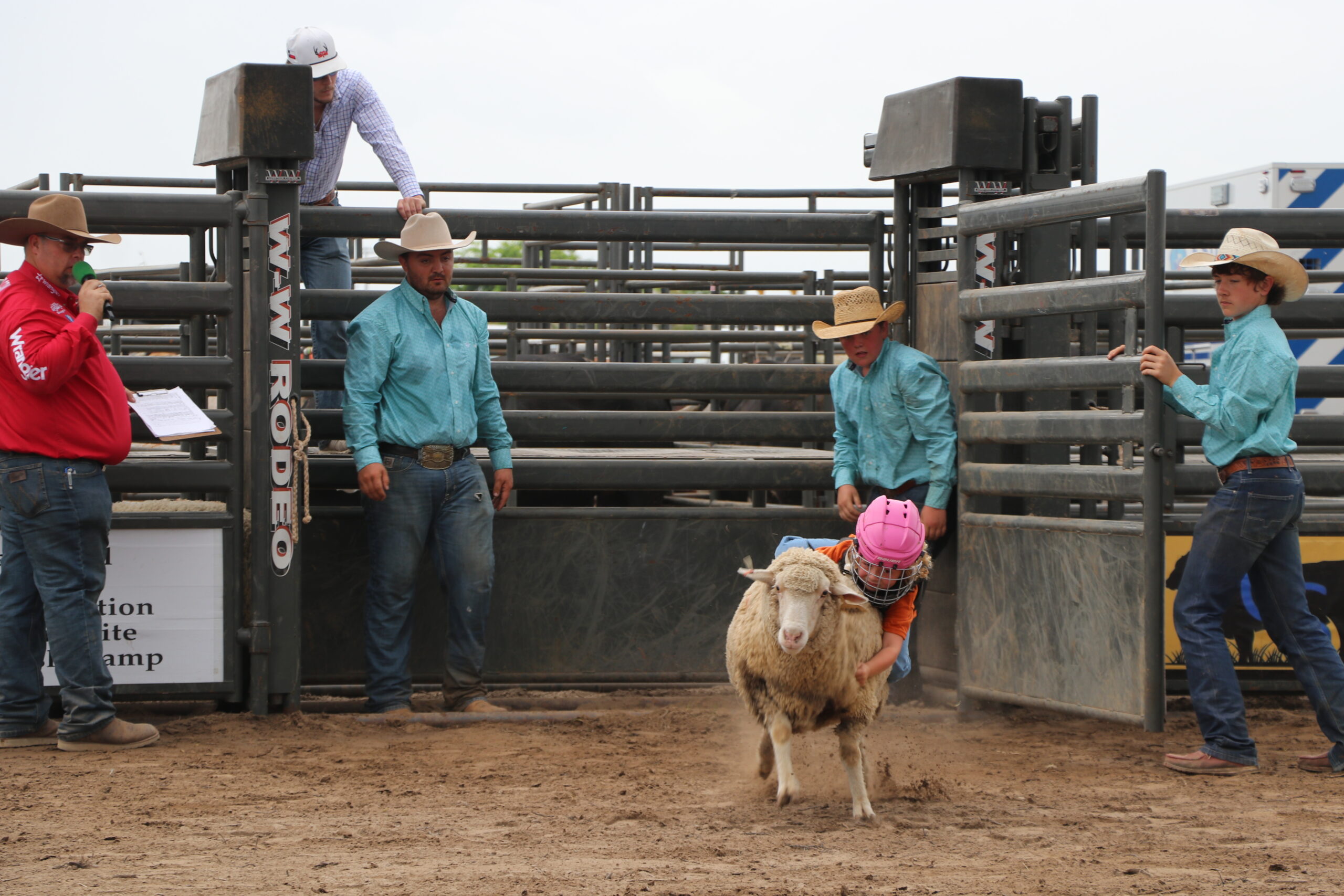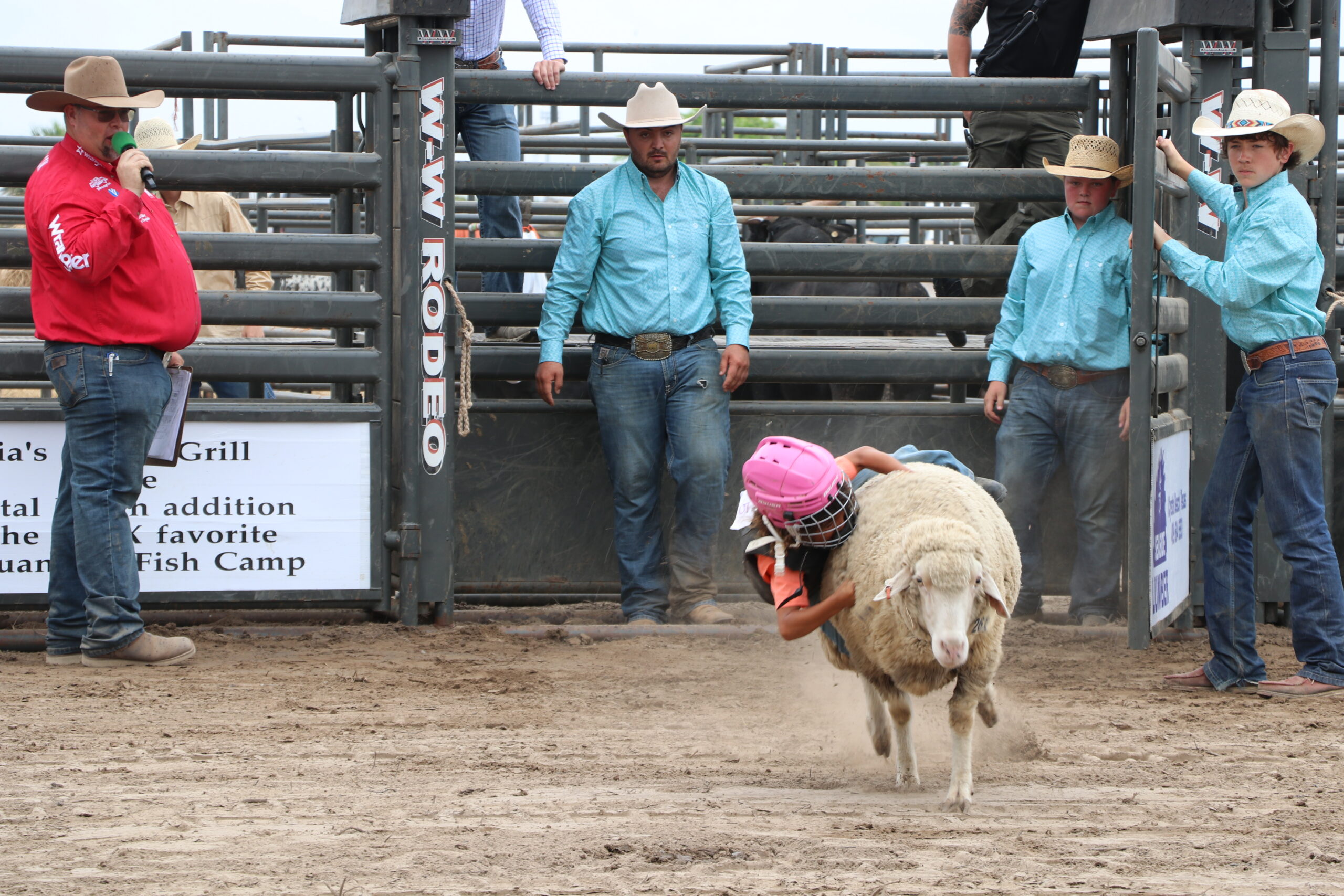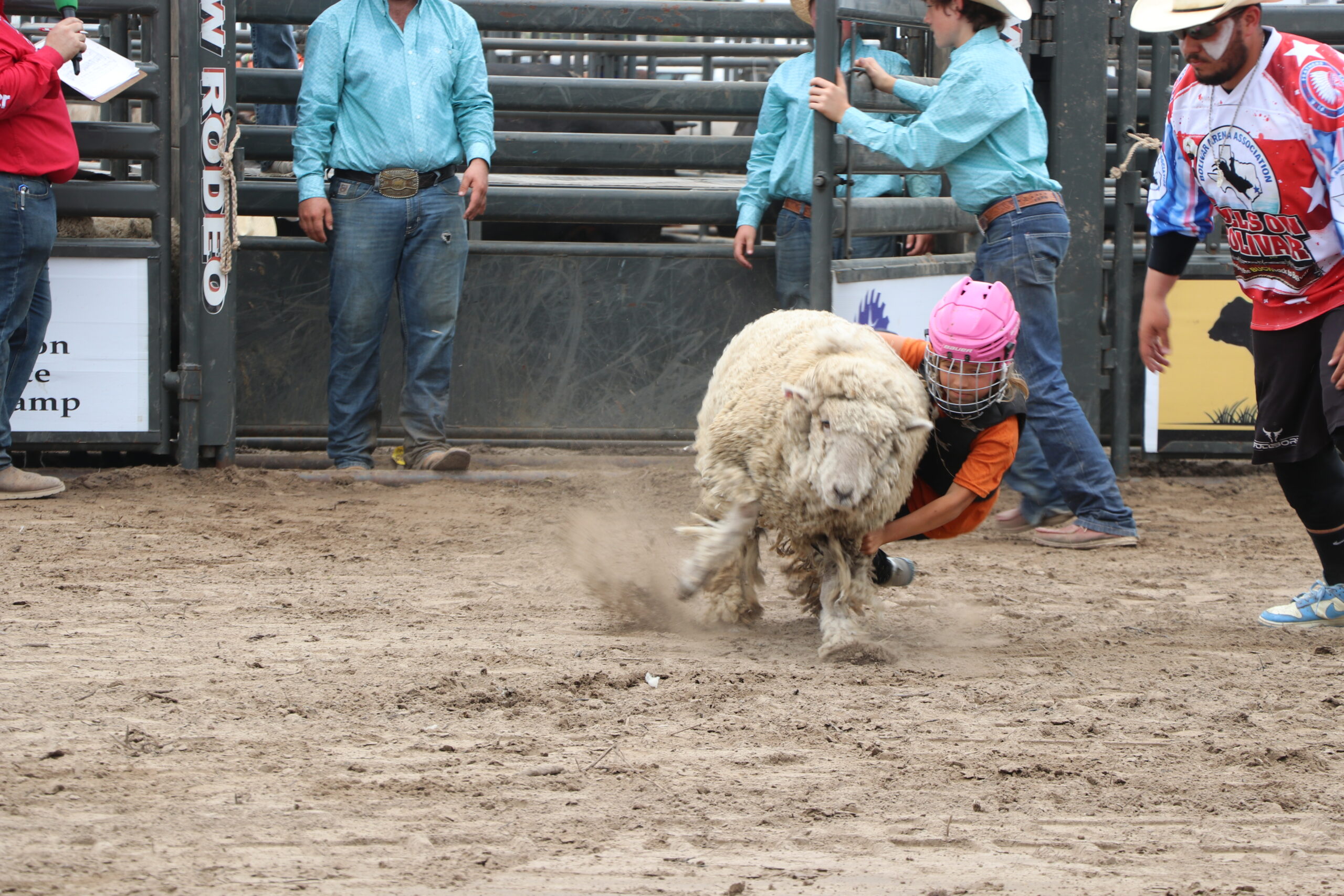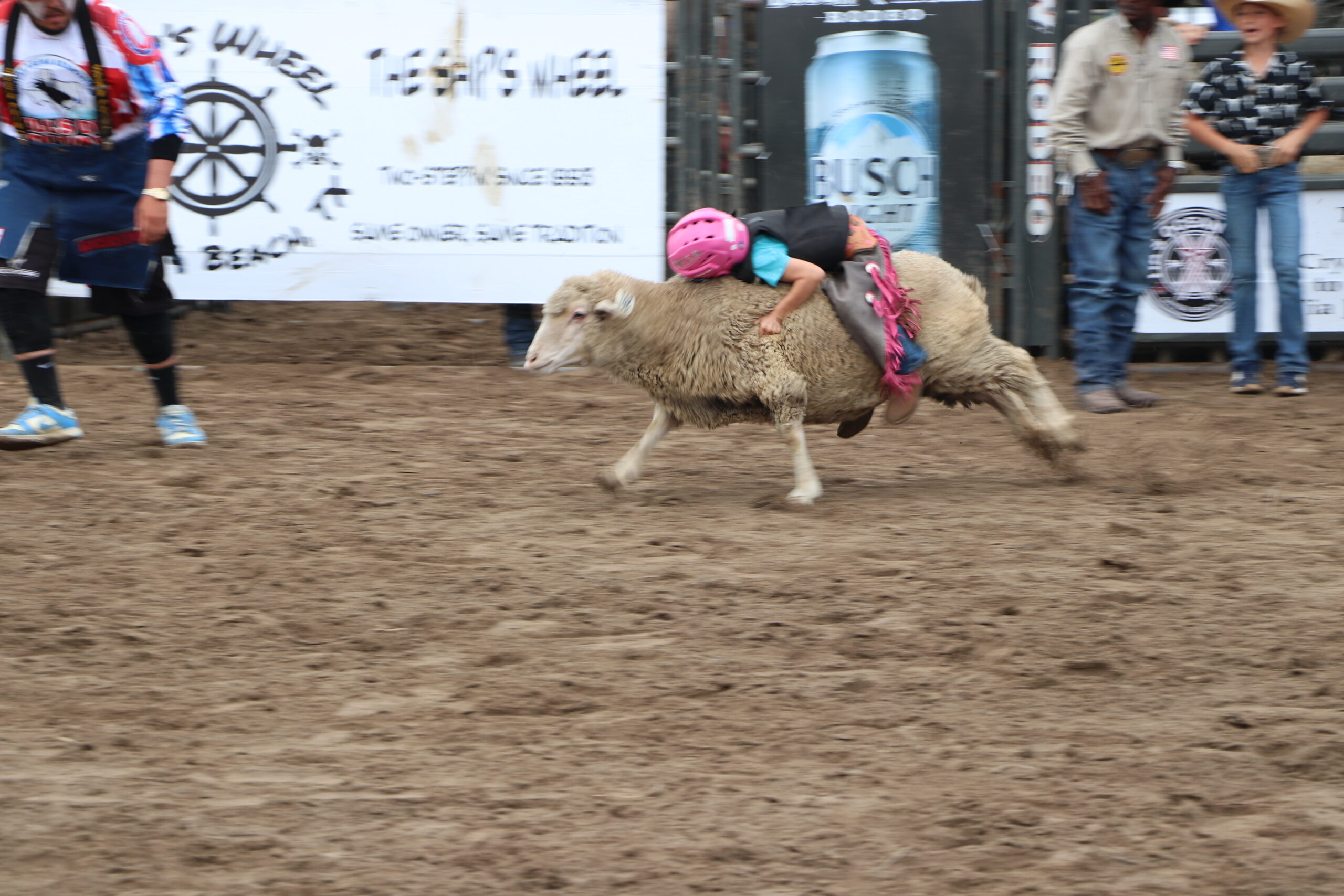 Drue Dallas holds on tight for her Mutton Bustin’ ride