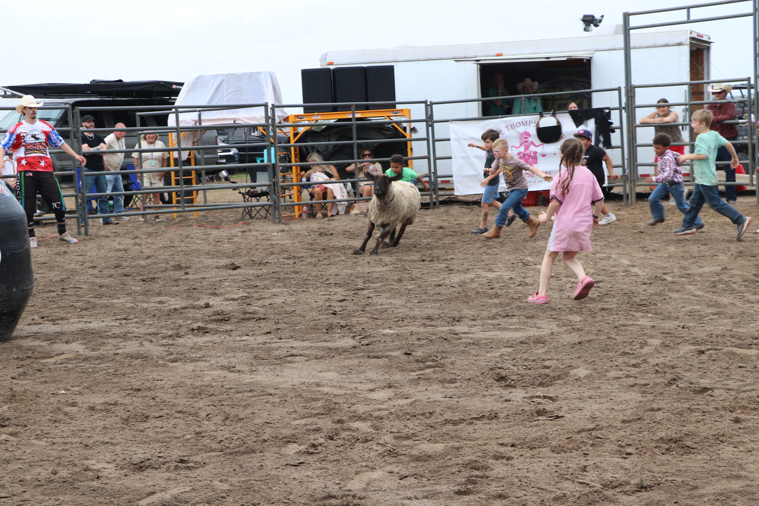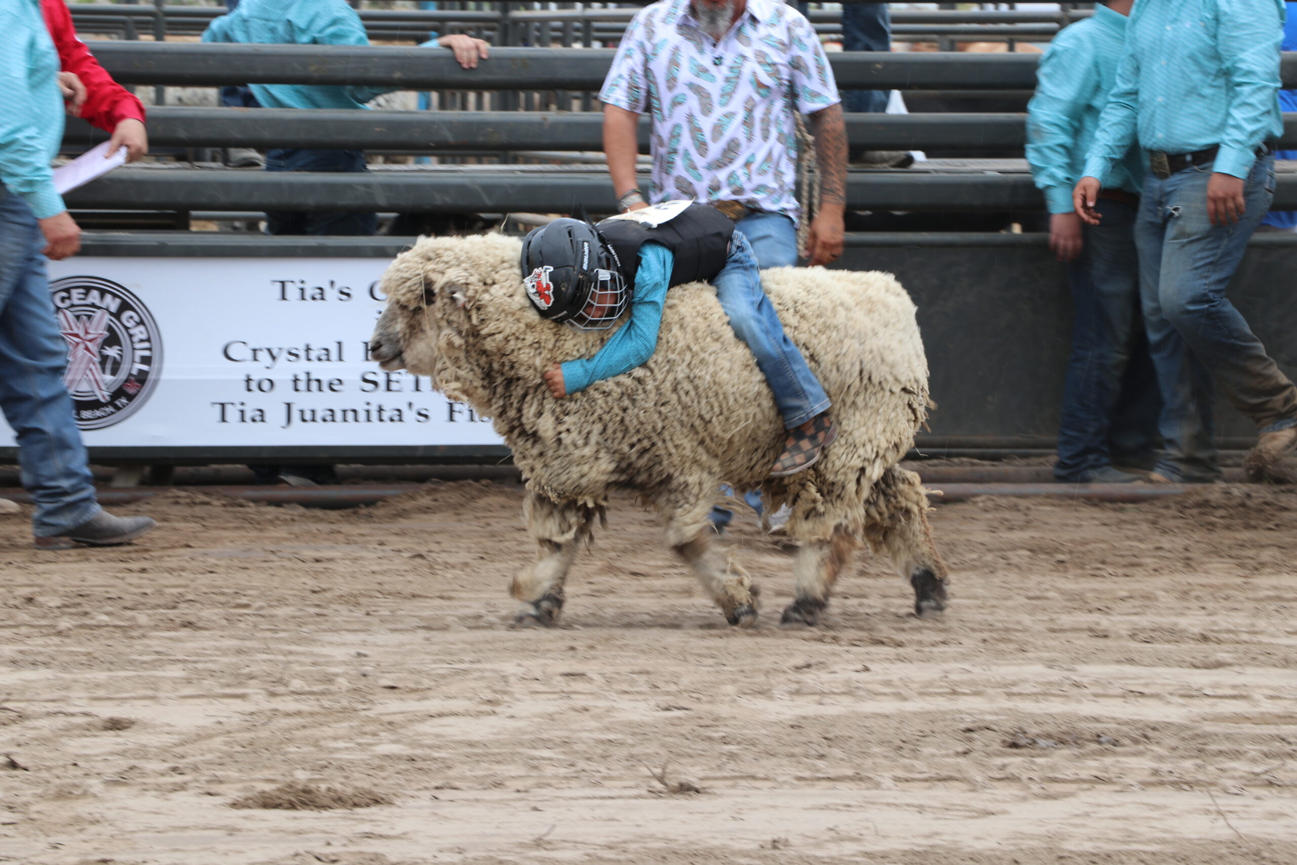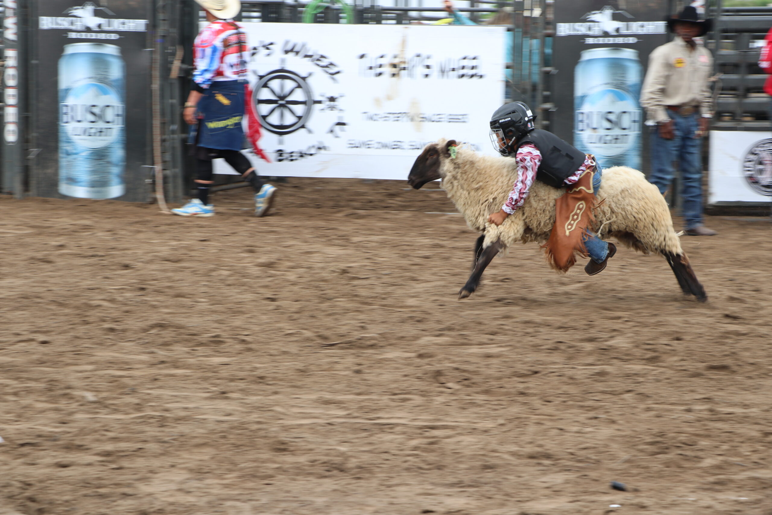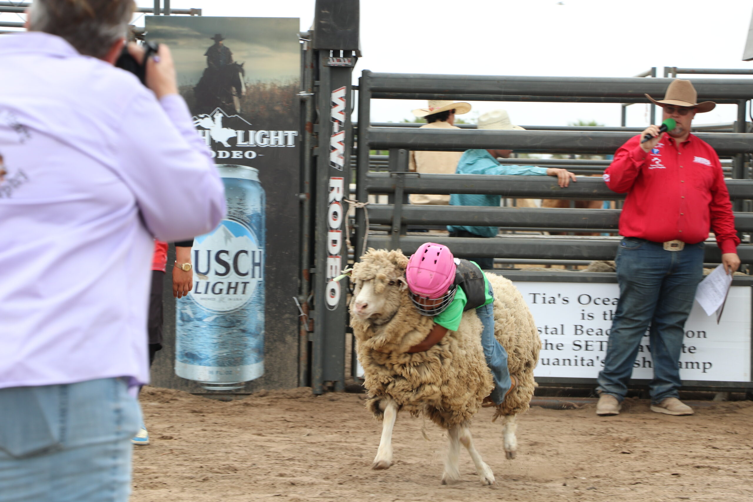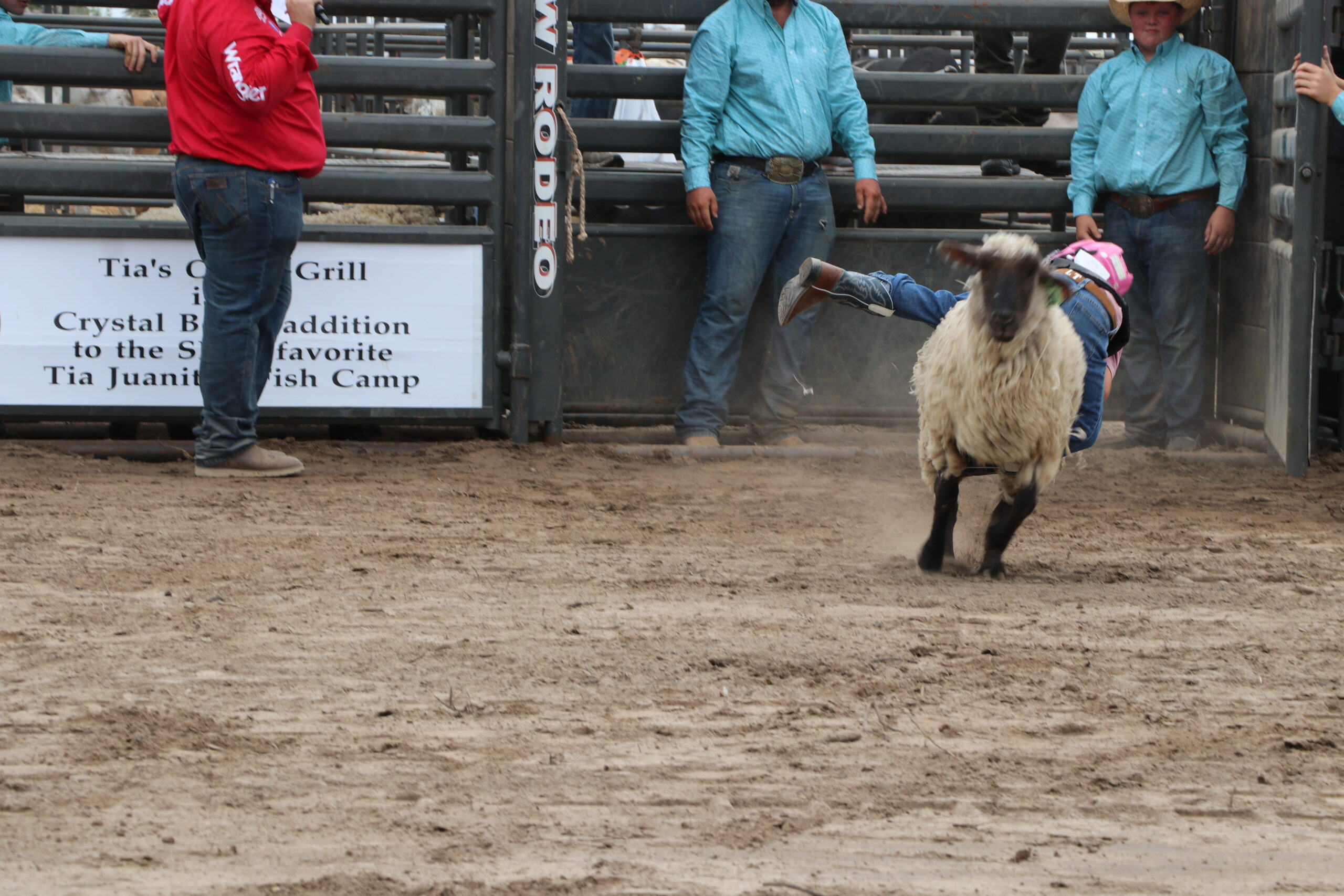 Drue Dallas holds on tight for her Mutton Bustin’ ride