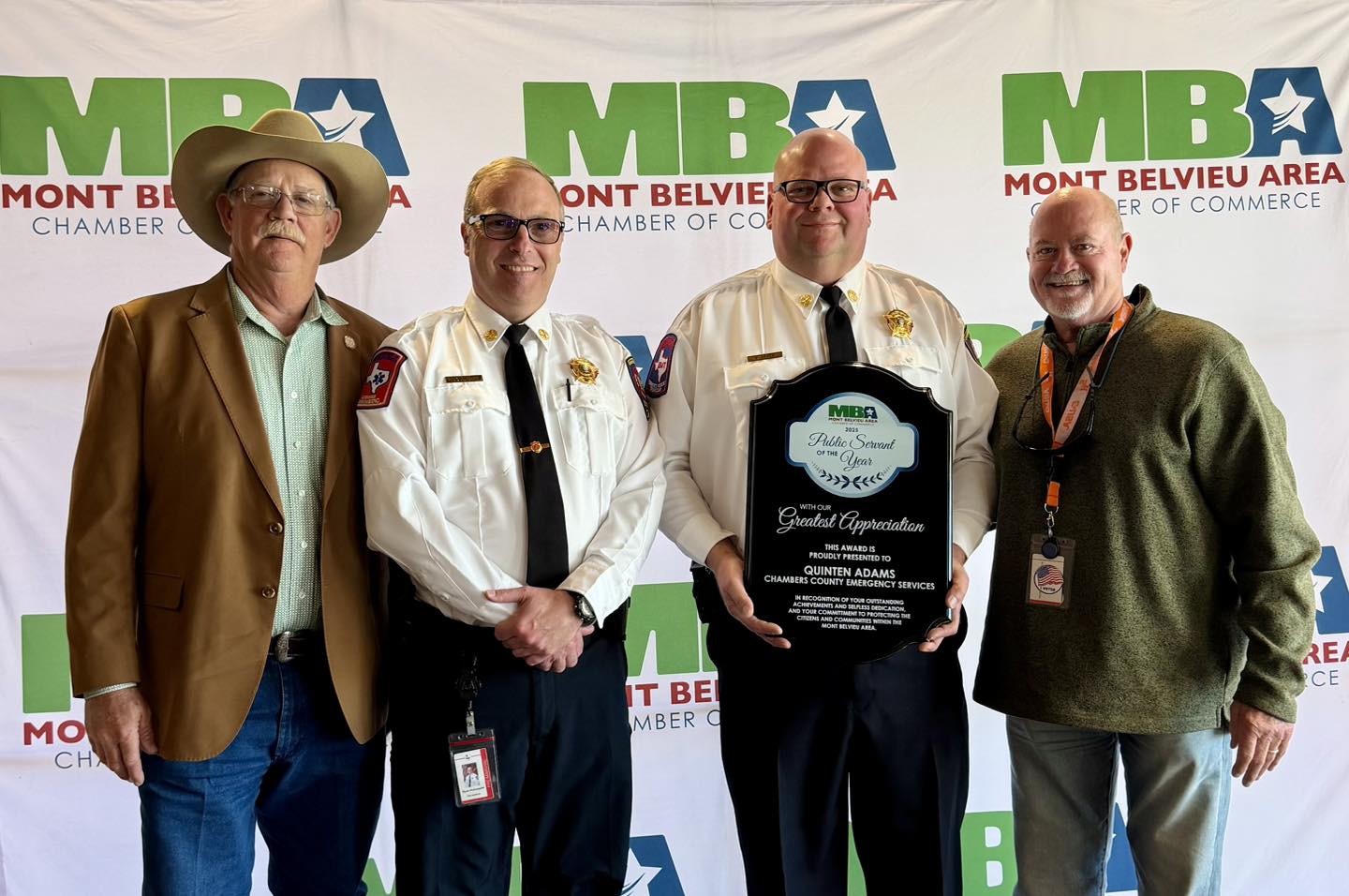 Quinten “Q” Adams, Chambers County Emergency Services Field Operations Support Division Chief, was awarded the 2025 Public Servant of the Year at the Mont Belvieu Area Chamber of Commerce Annual Awards luncheon earlier this week.