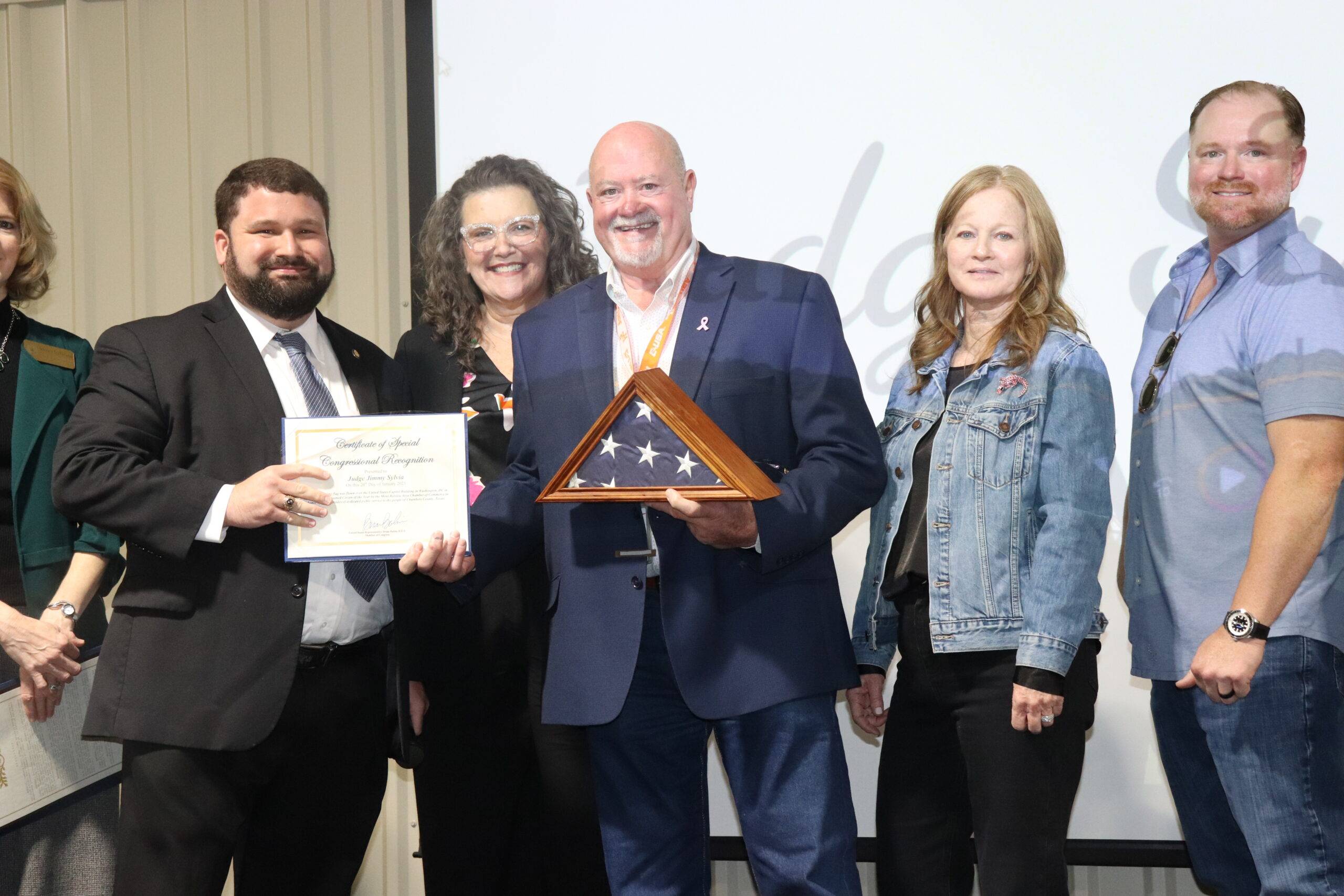 The crowd was very enthusiastic and showed their appreciation of Judge Sylvia’s service to Chambers County. Lanie Brown and Will Cain presented the Judge with a flag flown over the US Capitol building on behalf of US Representative Brian Babin and Susan Leblanc presented a certificate of appreciation and recognition from the Texas State House of Representatives on behalf of State Representative Terri Leo Wilson.