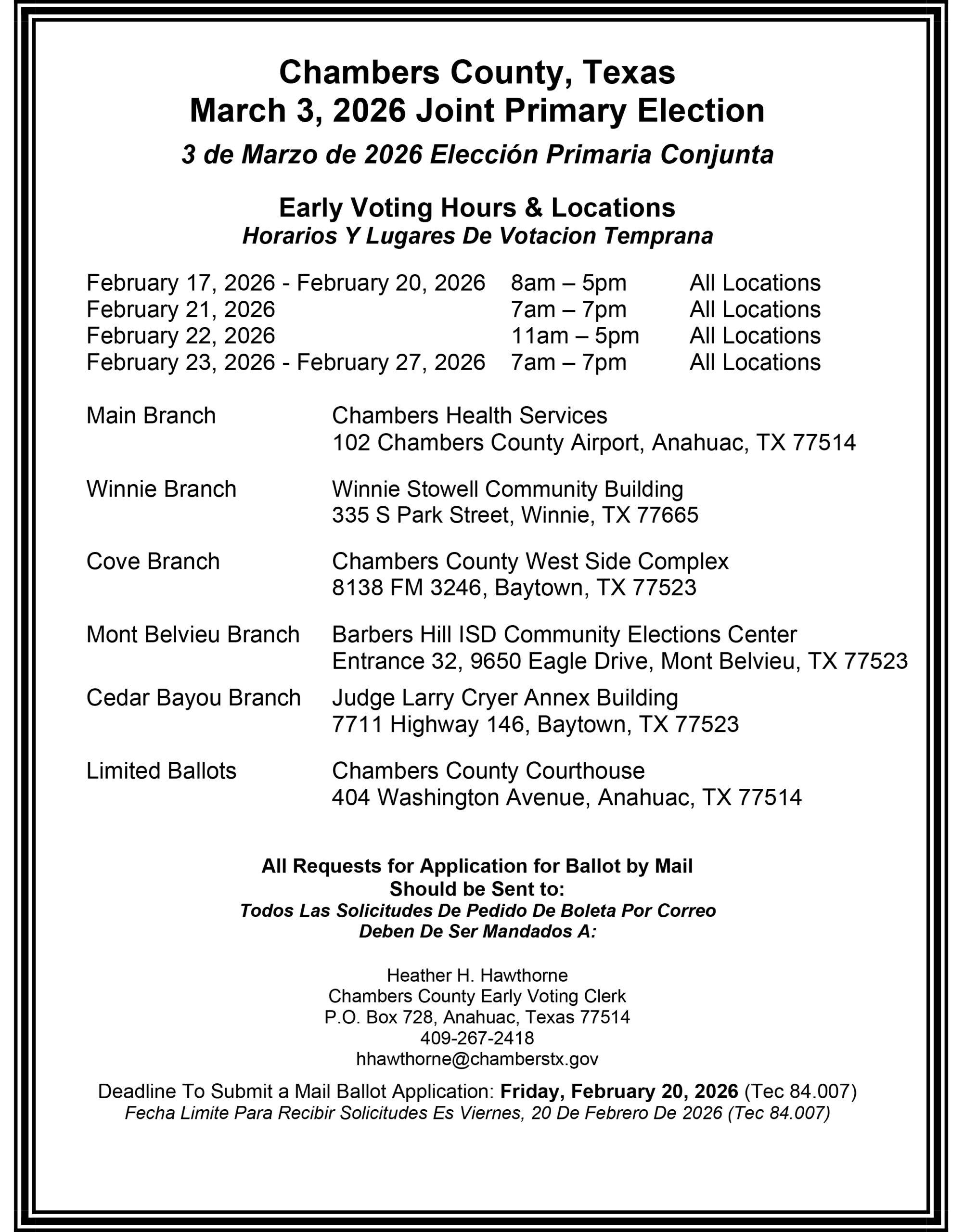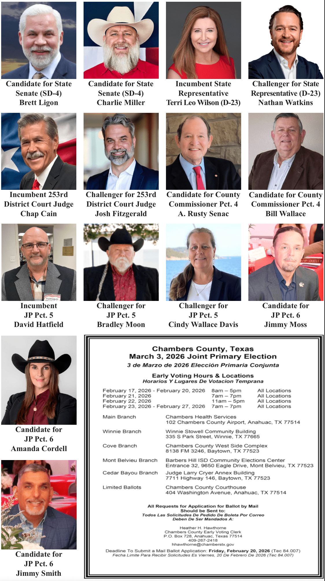Below are candidates who are in contested races in Chambers County for the 2026 GOP primary election. Early voting begins on Tuesday, February 17th. Time, location, and dates are listed below or can be found on the Chambers County Clerk website. Sample ballots are on the website as well.
